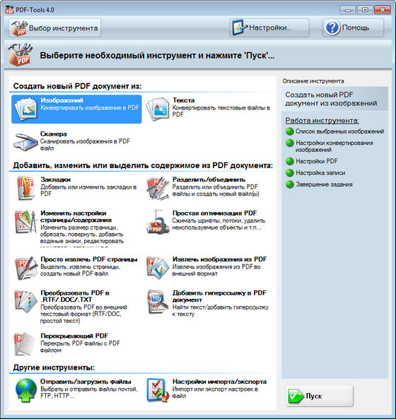 В комплекте с профессиональной версией PDF-XChange поставляется также PDF-Tools - инструмент для создания новых PDF-файлов из изображений и манипулирования имеющимися файлами. С помощью этого инструмента можно с легкостью объединять PDF-файлы, удалять из них страницы, извлекать отдельные фрагменты, изображения и текст, создавать и редактировать закладки, а также отправлять файлы по электронной почте и размещать их на серверах по протоколам HTTP и FTP.