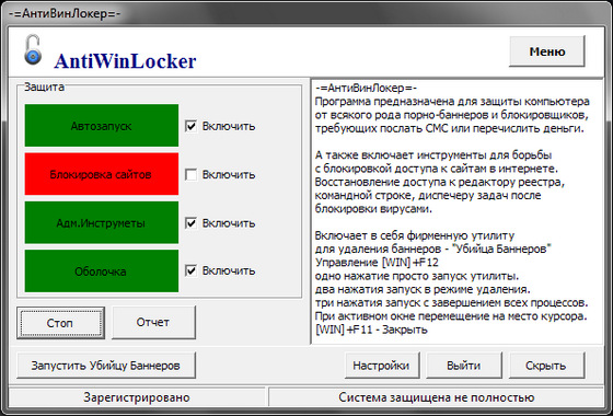 AntiWinLocker - это защита от блокировщиков Windows, от блокировки порнографическими баннерами, которые требуют перечислить деньги на счёт или послать sms. Автоматическое восстановление работы операционной системы без переустановки Windows. Простое и эффективное решение. Защитите свой компьютер - установите AntiWinLocker.