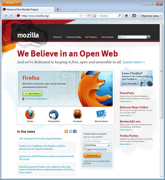 Mozilla Firefox - очень быстро работающий браузер, причем быстрота работы заметна не только во время загрузки веб-страниц, но и при поиске в закладках и истории. Сделан он на основе движка Mozilla и позволяет просматривать все веб-страницы в одном многовкладочном окне, а также обладает множеством других полезных опций, включая способность значительного расширения возможностей подключением плагинов (а выпущено их великое множество).