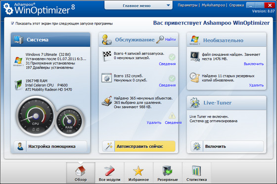 Ashampoo WinOptimizer - новая 8-ая линейка пакета программ, позволяющего оптимизировать операционную систему за счет ее настройки и очистки. Включает в себя утилиты для очистки жесткого диска и системного реестра, модуль для обеспечения защиты личной информации путем поиска и удаления файлов и данных, оставшихся после интернет-cepфингa, утилиту для оптимизации интернет-соединения, модуль для настройки программ, автозагружаемых одновременно с запуском системы, а также модули для поиска и удаления ненужных фaйлoв DLL, для безвозвратного удаления данных и для шифрования файлов. Кроме этого, программа позволяет переназначать ассоциации файлов, шифровать и расшифровывать файлы, а также безвозвратно их удалять. Наконец, возможна настройка параметров системы и ее оптимизация за один клик. В 8-ой версии программы появилось немало новых возможностей, новые модули, включая новый антишпионский модуль и менеджер контекстного меню Windows, а также множество улучшений и исправлений.