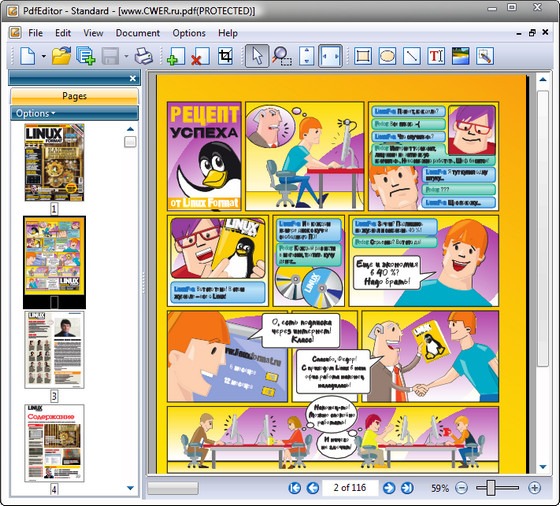 - Редактирование текста непосредственно в документе, изменение типа шрифта, размер, цвет, формат, масштаб и последствия редактировать, перемещать, удалять, вращать, копировать и вставлять, группы, якорь, согласования и зеркало текста, изображений и путей, изменение порядка страниц .