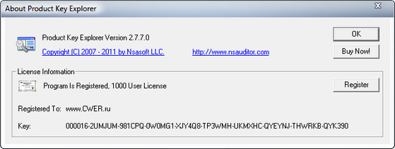 Product Key Explorer мощная утилита, которая может помочь восстановить утерянные ключи для многих популярных программных продуктов (в том числе Microsoft Windows 7, XP, Vista, Office, Adobe CS5, CS4, CS3 и т.д.). Product Key Explorer автоматически восстанавливает серийные ключи от существующей системы и с сетевых компьютеров.