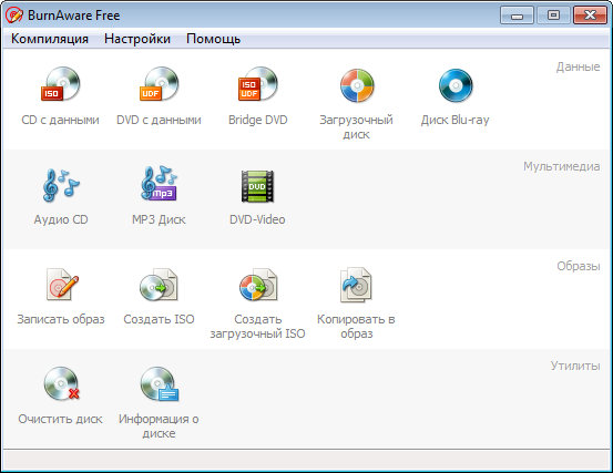 BurnAware Free - относительно небольшая, бесплатная и простая в использовании программа для записи информации и музыкальных композиций на CD, DVD, Blu-Ray и HD-DVD диски, которая пригодится как опытным пользователям, так и новичкам. BurnAware поддерживает работу со всеми типа оптических дисков (включая CD-R/RW, DVD-R/RW, DVD+R/RW, BD-R/RE, HD-DVD-R/RW и DVD-RAM) и аппаратными устройствами записи. Утилита поддерживает создание образов, способна писать мультисессионные диски, имеет опцию проверки записанного содержимого.