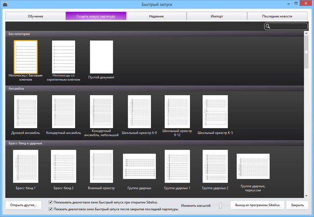 - Оптимизация интерфейса для использования одного монитора. Мы понимаем, что многие из наших клиентов предпочитают ноутбуки или другие системы с одним монитором. Поэтому интерфейс Sibelius 8 был разработан таким образом, чтобы позволить в любой ситуации, времени и месте сосредоточить внимание на музыке — и легко скрывать информацию, обращаться к которой Вам нужно только время от времени.