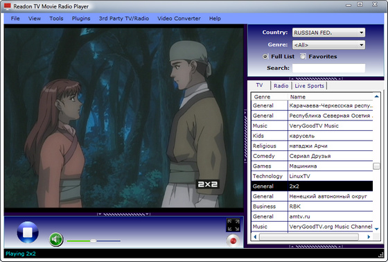 Readon TV Movie Radio Player представляет собой программу, с помощью которой Вы сможете просматривать тысячи различных каналов Интернет-телевидения и Интернет-радио. Понравившиеся музыкальные композиции можно сохранить в формате mp3. Программа имеет удобный интерфейс: все каналы разбиты по странам (есть несколько десятков на русском языке) и категориям. Readon TV Movie Radio Player- это действительно лучший программный продукт в своей области.