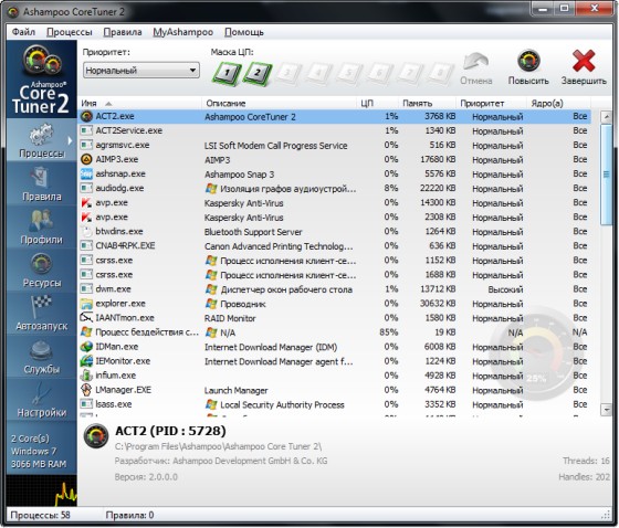 Ashampoo Core Tuner 2 - позволяет оптимизировать производительность вашего многоядерного процессора. Многие современные компьютеры работают на двухъядерных процессорах, некоторые даже на четырехъядерных. К сожалению, Windows не всегда хорошо управляет несколькими ядрами, из-за чего вы не получаете реальную мощность и производительность от купленного процессора. Ashampoo Core Tuner предоставляет пользователям мощный и простой в использовании инструмент для оптимизации многоядерных и многопроцессорных систем под управлением операционной системы Windows, чтобы достичь полной мощности и производительности от процессора.