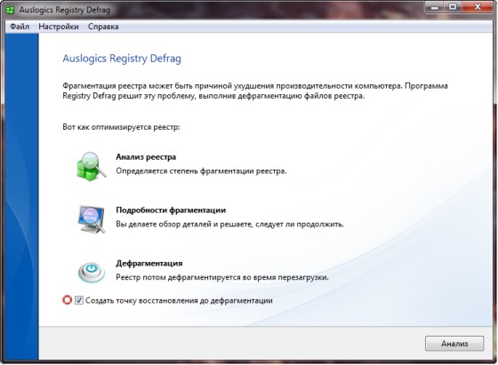 Auslogics Registry Defrag - отличная программа для дефрагментации реестра операционной системы. Auslogics Registry Defrag позволяет ускорить работу Windows за счет дефрагментации реестра, оптимизации размещения информации в нем, а также благодаря исправлению ошибок, накапливающихся в реестре в процессе его долгой эксплуатации. ОС Windows осуществляет сотни обращений в секунду для чтения и записи данных в реестре и его медленная работа - одна из важнейших причин медленной работы всей системы в целом.
