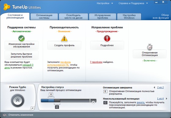 TuneUp Utilities обеспечит Вас отчетом о проделанной работе, покажет Вам, какое обслуживание и другие задачи оптимизации Вы уже сделали и какую пользу это вам принесло.