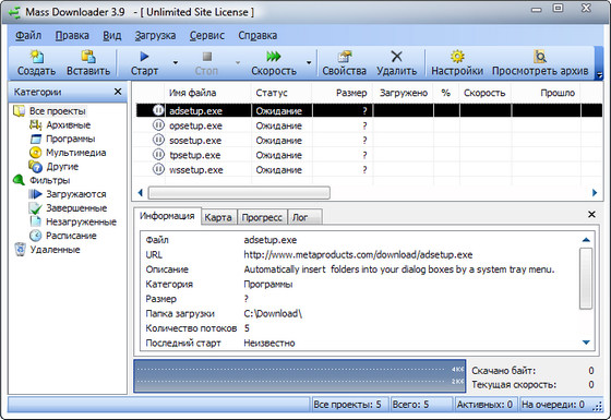 MetaProducts Mass Downloader - программа для удобного скачивания файлов из Интернета по протоколам HTTP и FTP, созданная на базе Offline Browser, разница только в том, что менеджер закачки загружает указанные пользователем файлы, а оффлайн-браузер - все файлы сайта. Программа разбивает закачиваемый файл на части и качает все части одного файла одновременно, тем самым увеличивая скорость. Может автоматически соединиться с провайдером, закачать файл и отключиться. Также позволяет докачивать файл после разрыва соединения (при условии, что сервер поддерживает докачку). Поддерживаемые протоколы HTTP, FTP, HTTPS, RTSP, MMS и MMST. Имеется интеграция с веб браузерами Internet Explorer, Opera, Netscape Navigator, Mozilla, Firefox, Seamonkey и Flock. Программа имеет многоязычный интерфейс, включая русский язык и поддерживает работу с Windows Se7en.