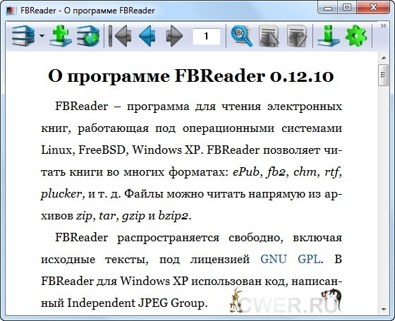 FBReader распространяется свободно, включая исходные тексты, под лицензией GNU GPL. В FBReader для Windows использован код, написанный Independent JPEG Group...