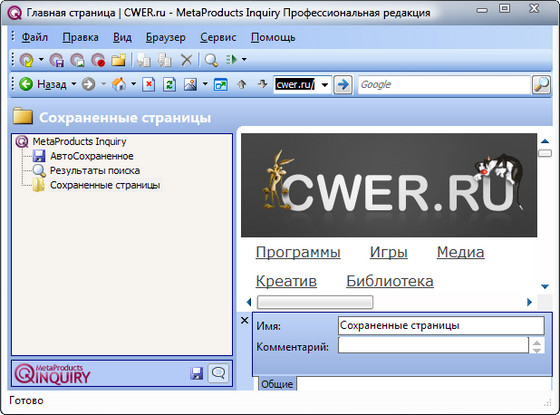 Inquiry - программа позволяет быстро и просто сохранять веб-страницы целиком или некоторые их фрагменты. Открытые вами страницы сохраняются всего одним кликом. Программа имеет встроенный HTML-редактор, возможность поиска внутри сохраненных страниц и многое другое. Предназначена для работы под различными системами Windows и полностью интегрировано в Microsoft Internet Explorer. Помимо интеграции с IE, Inquiry интегрируется в Firefox, а также имеет самостоятельное решение, позволяющее использовать его и в качестве браузера, и в качестве программы для сохранения страниц. В последних версиях добавлено подтверждение, когда страница сохраняется или, если страница с таким адресом уже есть в папке, диалог свойства папки, возможность изменения начальной страницы в браузере программы, возможность показывать последнюю открытую страницу при запуске. Inquiry имеет русифицированный интерфейс и русскую справку для помощи в освоении этой программы.
