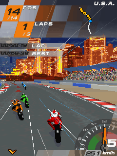 Игра для мобильных телефонов. Штурмуйте треки в ажиотаже мотогонок на сверхмощных мотоциклах. Размеры экранов: 176х220, 240х320.