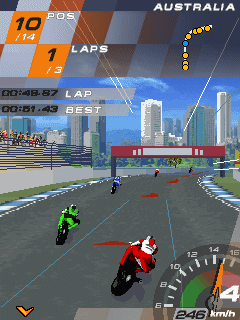 Игра для мобильных телефонов. Штурмуйте треки в ажиотаже мотогонок на сверхмощных мотоциклах. Размеры экранов: 176х220, 240х320.