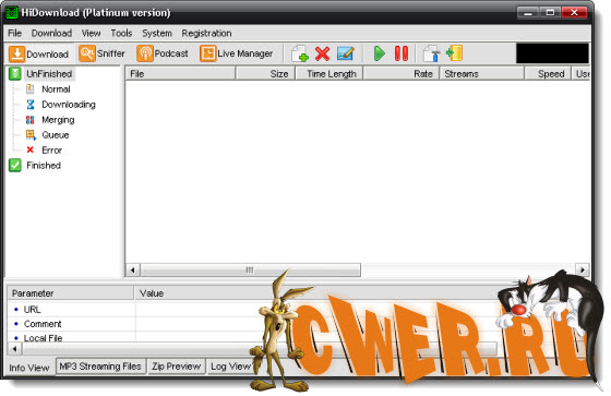 HiDownload - менеджер загрузок. Поддерживает работу по протоколам HTTP, FTP, RTSP (Windows Media), PNM, MMST и MMSU (это значит, что потоковое аудио - RA, RM и Apple Quicktime Streaming - можно "скачать" без проблем). Может работать через прокси, позволяет просматривать архивы и скачивать из них только необходимые файлы, позволяет сохранять Flash, имеется встроенный поиск MP3-файлов. Кстати говоря, есть у этой программы и внутренний поиск.