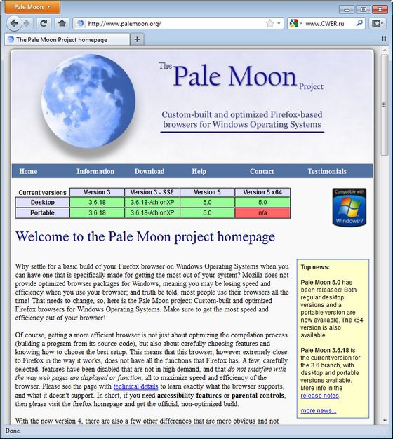 Разработчики из проекта Pale Moon («Бледная луна») представили собственный вариант браузера Firefox, оптимизированный для использования всех ресурсов операционных систем Windows, в том числе Windows 7. Оптимизация исполняемого кода при компиляции помогла сохранить полную совместимость с расширениями Firefox и обеспечила солидный выигрыш в скорости – около 25%, по результатам теста SunSpider.