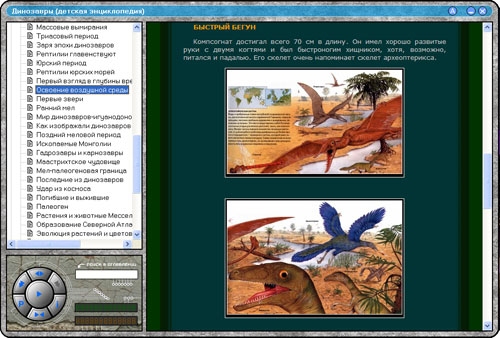 Энциклопедия в доступной и интересной форме расскажет о том, кто такие динозавры, как и где нашли их остатки, в каких природных условиях жили динозавры, как размножались, с какой скоростью могли перемещаться, что представляла собой Земля в триасовый, юрский и меловой периоды мезозойской эры. В энциклопедии описано более 50 растительноядных и более 40 хищных динозавров. Энциклопедия красочно иллюстрирована, содержит трехмерные модели динозавров, которых можно рассмотреть со всех сторон. Диск станет прекрасным подарком как для ребенка, так и для взрослого.