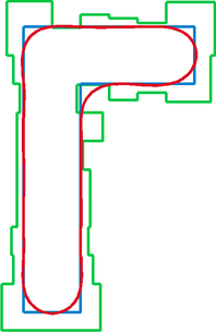 OPC: требуется вычислить такую маску (зелёный контур), чтобы получаемый ею символ (красный) оказался как можно ближе к требуемому (синий). Без коррекции толщина линий символа окажется больше или меньше в разных частях, в т.ч. за счёт влияния соседних линий. Это может привести как к разрыву дорожки, так и к замыканию пары дорожек.