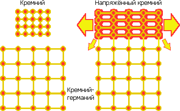 В 2001 г. IBM изобретает напряжённый кремний (strained silicon) — формирование слоя кремния для канала, в котором расстояние между атомами (как минимум в направлении исток-сток) не равно естественному шагу кристаллической решётки (543 пм). Для большего шага сначала внедряется «посевной» слой кремния-германия. Кристалл германия имеет шаг атомов 566 пм (именно из-за большей подвижности носителей заряда его первым стали применять в электронике). Смешанный полупроводник сохраняет это значение, даже если доля германия всего 17% (это для 90 нм; а для 32 нм — уже 40%). Осаждаемые поверх атомы кремния межатомными силами крепятся к атомам широкой решётки и остаются с её шагом, формируя затвор. Разряжение атомов увеличивает подвижность электронов, что ускоряет транзистор на 20–30%.