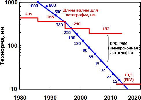 Технорма для ЦП Intel. По мнению компании, 15-нанометровый техпроцесс, возможно, станет первым, где будет применяться «экстремальный» ультрафиолет (EUV), если он окажется экономически оправданным. До сих пор чрезвычайная дороговизна (даже по меркам фотолитографов) сдерживала его внедрение, которое 10 лет назад пророчили уже для 45-нанометрового процесса. Основные причины — необходимость в совершенно новом источнике излучения, новой зеркальной (а не линзовой) оптике и полном вакууме в рабочей зоне.