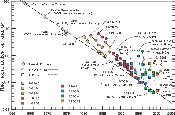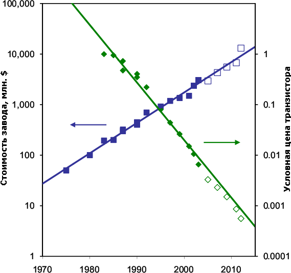 Стоимость постройки наиболее современного на указанный год завода (или его стоимость после обновления) возросла в 70 раз за 30 лет, а цена каждого выпускаемого ими транзистора упала в 2000 раз. Пустые квадраты означают примерные цифры. Тут не хватает графика производственной мощности, но надёжных данных по ней на весь период нет. Впрочем, известно, что современные фабы выпускают от 10 до 60 тыс. пластин в месяц в случае логики и ещё в 2–3 раза больше для памяти. Выпуск пластин удваивается примерно каждые 5 лет, помимо увеличения их диаметра. А «удвоение стоимости фаба каждые 4 года» даже было названо «вторым законом Мура» (иначе — законом Рока, Rock’s law), который в конце 90-х также пришлось поправить — каждые 5 лет. Наиболее дорогой станок — фотолитограф — дорожает с такой же скоростью: первый коммерческий проекционный степпер (1973 г.) стоил 210 тыс. долларов, а современный сканер — 40–50 млн..