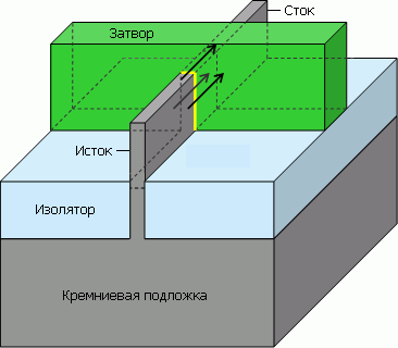 «Трёхзатворный» транзистор на деле означает транзистор с каналом, окружённым затвором (через прослойку в виде тонкого изолятора, обозначенного жёлтым) с трёх сторон — по сравнению с планарным, где поверхность сопряжения представляет собой одну плоскость.