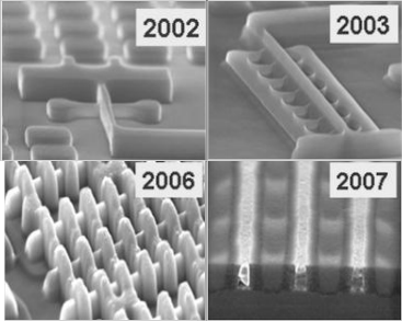 4 поколения «плавниковых» транзисторов Intel — демонстрация конструкции (2002 г.), многозатворность (2003), ячейки СОЗУ (2006) и адаптация металлического «затвора последним» (2007).