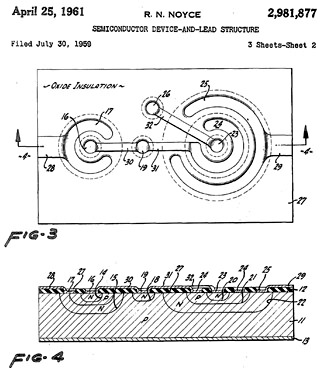 Патент Нойса на планарную ИС. Тут все контакты находятся уже по одну сторону от кремниевой пластины.