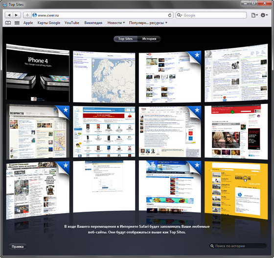 Safari - это Windows-версия встроенного в операционную систему Mac OS X браузера. Тут присутствуют самые прогрессивные возможности, присущие современным браузерам. Это многооконный интерфейс, расширенные инструменты безопасности (блокирование всплывающих окон, отображение уровня безопасности веб-сайта, поддержка SSL 2/3 и т.д.), встроенные средства для чтения RSS-лент и автоматического заполнения веб-форм, механизм закладок, поддержка плагинов и многое другое. По утверждениям разработчиков, Apple Safari заметно быстрее загружает веб-сайты и обрабатывает их скрипты, чем популярные браузеры платформы Windows. Для работы данного браузера необходим мультимедийный проигрыватель QuickTime, который содержится в установочном пакете программы.