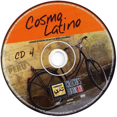 Cosmo Latino от Compact Disc Club - сборник для поклонников латиноамериканской музыки. Исполнители: Trio Mocoto, Federico Aubele, Juanes, Polo Montanez, Orquesta Aragon, Julieta Venegas, Amaral, Bajofondo & Mala Rodriguez, Paulina Rubio, The Rosenberg Trio, Polo Montanez, Tania Libertad, Sonora Dinamita, Celia Cruz, El Chicano, Gloria Estefan, Daniel Santos ... Песни: No woman no cry, La camisa negra, Bamba, Enamaorada estoy, Quien sera, Linda, Salsa, Latin brother, Hey Joe ...