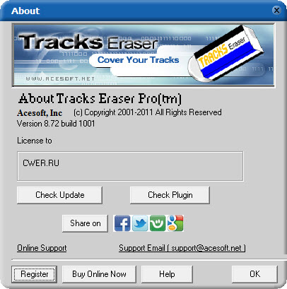 Tracks Eraser Pro - утилита для удаления ненужной информации с вашего ПК. Она встраивается в Internet Explorer и проводит очистку, интернет файлов таких как ( куки, URL, кэш, переходы и т.д. ). Программа позволяет очищать адресную строку истории для IE, Netscape, AOL, Opera. Удаляет куки для IE, Netscape, AOL, Opera. Очищает Internet кэш (временные Интернет файлы), удаляет интернет историю файлов, интернет историю поиска, удаляет IE плагины по выбору, index.dat файлы, Старт Меню. Удаляет временные файлы Windows, историю сохраненых dialog box.