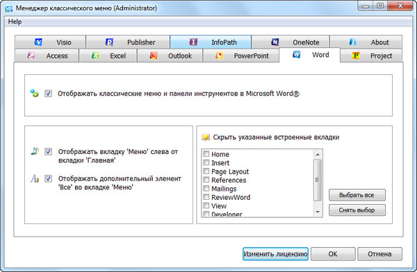 • вкладка с классическим меню для Word 2007/2010