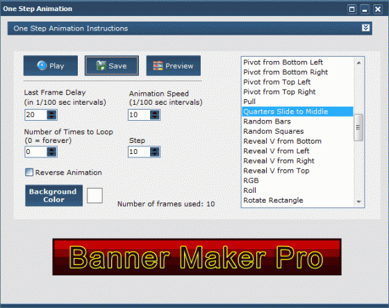 - One Step Animation - create animated buttons and banners quickly and easily - select the type of animation and save. That's it. Over 60 different one-step animations to choose from.