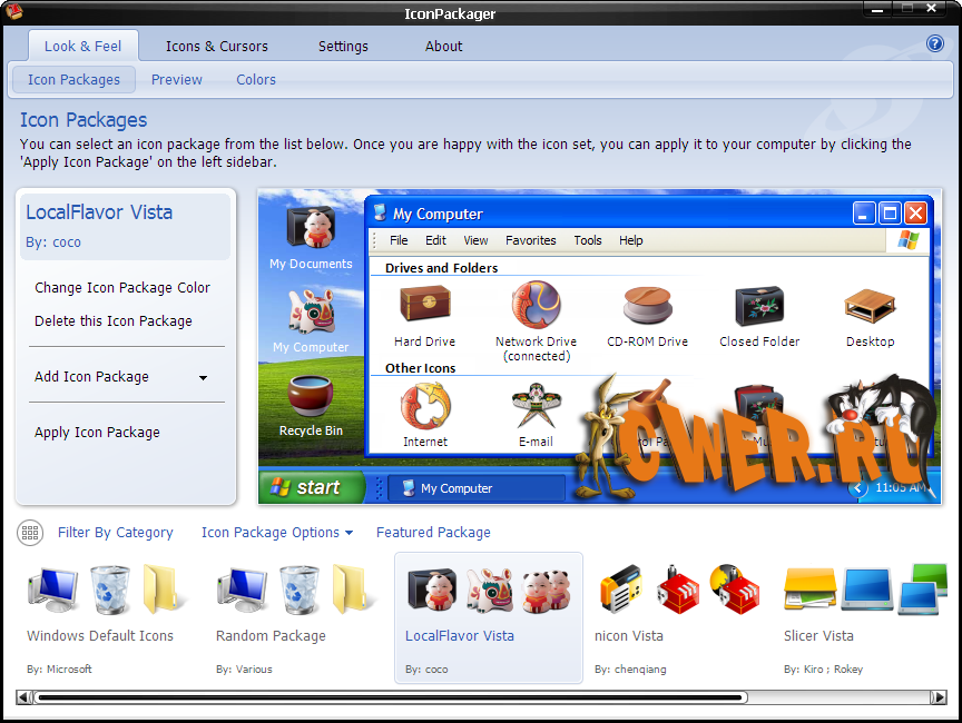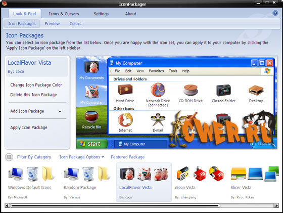 IconPackager является одной из наиболее универсальных и мощных, но всё же удобных программ для настройки оболочки Windows из доступных сегодня. IconPackager позволит Вам настроить особенности Windows, которые недоступны из стандартного интерфейса пользователя. Некоторые из этих особенностей смогут улучшить работу системы, некоторые смогут сделать вашу жизнь с Windows немного проще. Некоторые особенности IconPackager позволяют ему держаться на голову выше большинства подобных программ.