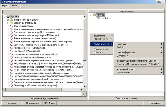 BatWithParameters - бесплатное приложение для управления сетью. Программа предназначена для администраторов сетей фирмы (предприятия). BatWithParameters позволяет выполнять на удаленном компьютере под управлением Windows XP любые действия (в частности в скрытом режиме), ограничиваясь только Вашей фантазией и навыками: устанавливать удаленно программы настраивать систему, выполнять мониторинг важных системных параметров и уведомлять администратора при их изменении...