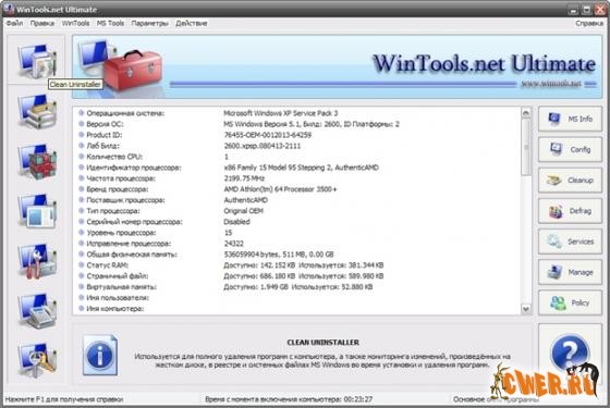 WinTools.net Ultimate – набор инструментов для оптимизации операционной системы Windows. В состав программы входят компоненты для полного удаления нежелательных программ и «мертвых» ссылок реестра, а также для контроля процессов, настройки системы, интернет-соединений и интерфейса. Кроме того, имеются утилиты для надежного хранения конфиденциальной информации. Работает на платформах Windows 2000, 2003, XP и Vista.