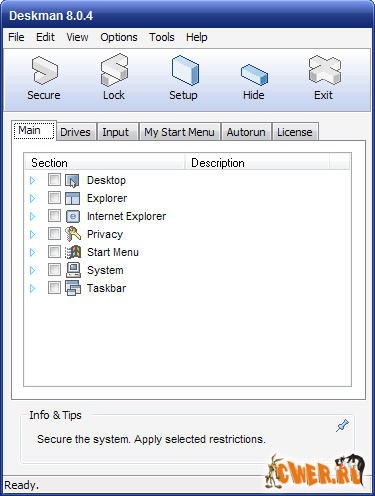 Anfibia Deskman ограничивает доступ к компьютеру и его настройкам. Домашним пользователям подойдет как средство блокировки компьютера на время временного отсутствия, администраторам - как многоплановый инструмент для ограничения возможностей пользователей по изменению настроек компьютера.
