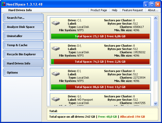 Need3space - это исчерпывающий набор инструментов для освобождения места на переполненных носителях. Позволяет освобождать свободную площадь за счет поиска и удаления одинаковых двойных файлов (по CRC32), временных и удаленных файлов, устаревших и редко используемых, пустых папок и файлов нулевого размера. С помощью анализатора диска, всего одним щелчком, поможет найти дополнительно огромную массу резервов для освобождения места. Выявит, какой из файлов самый большой по размерам, и какие группы файлов - кино, музыка, фотографии, программы - мертвым грузом лежат на оперативном диске, отчего появится желание перенести их на другие носители для длительного ответственного хранения. Присутствует и интегрированный деинсталлятор, который выведет для вас в окне данные о размерах, установленных в вашей системе приложениях, системных компонентах, сервисных паках и сломанных деинсталляторах, что даст еще источник расширения столь необходимого рабочего пространства. Присутствует продвинутый эксплорер корзины, имеет настройки масок исключения, имеет поисковый движок с малым потреблением ресурсов и контекстное меню для удобства управления с установкой приоритета выполняемых задач.