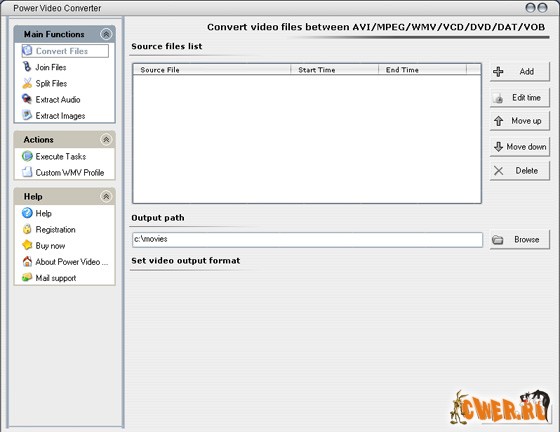 Power Video Converter является конвертером между популярными видеоформатами. Особенности: поддержка AVI, DivX, XviD, MPEG-4, MPEG1, MPEG2, VCD, SVCD, DVD, WMV, ASF, DAT, VOB форматов, пакетный режим конвертирования, высочайшая скорость конвертирования, поддержка PAL-, NTSC-видео, нарезка видео на фрагменты (ролики) по выбранному размеру или по временным позициям во встроенном проигрывателе, соединение фрагментов в один большой видеофайл, извлечение аудио из видео и сохранение в mp3-, wav-, wma-форматы, извлечение фрейма или разложение видео на последовательность bmp-картинок, создание или загрузка wmv-профиля, простой и удобный интерфейс, выбор и настройка кодеков, настройка параметров конвертирования, низкие системные и аппаратные требования.