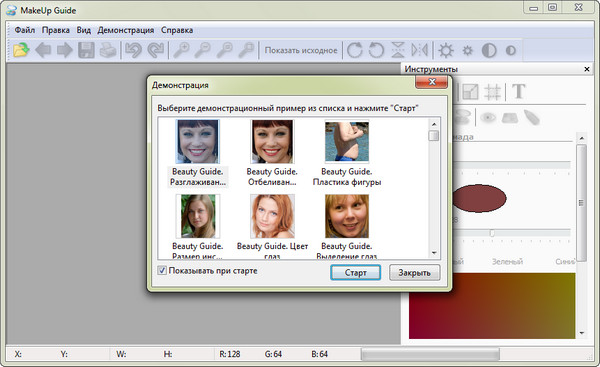 Программа поможет накрасить губы; нанести румяна, тени и пудру; подвести глаза и изменить их цвет. Нанести макияж Вы можете следующими инструментами из виртуальной косметички: Губная помада, Пудра, Румяна, Цвет глаз, Тени, Подводка. В программу включены анимированные примеры обработки фотографий: изменение цвета глаз; запудривание излишнего блеска на коже; макияж глаз; макияж губ и скул.