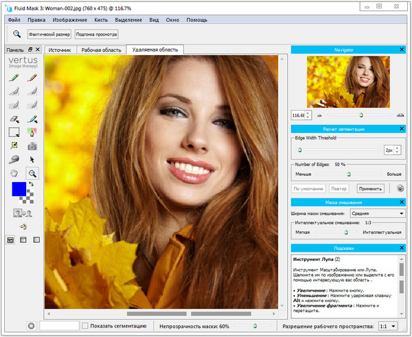 Vertus Fluid Mask представляет собой наполовину автоматизированный инструмент, позволяющий вырезать из слоя объекты по выбору пользователя. Работает довольно просто: предварительно слой анализируется, и программа выделяет на нем все четкие и нечеткие границы, которые находит на этапе анализа изображения (раньше требовалось нажимать специальную кнопку, теперь все делается автоматически при открытии изображения), работает программа, сворачивая полностью сам Photoshop и подгружая собственный интерфейс. Затем вы выбираете любой из ручных инструментов, кистей, которыми закрашиваете секции изображения, откидывая ненужные и принудительно оставляя те, у которых хотите поменять фон. Вся работа теперь занимает не так много времени, так как Fluid Mask учитывает особенности архитектуры новых процессоров и работает в разы быстрее, чем его предшественники.