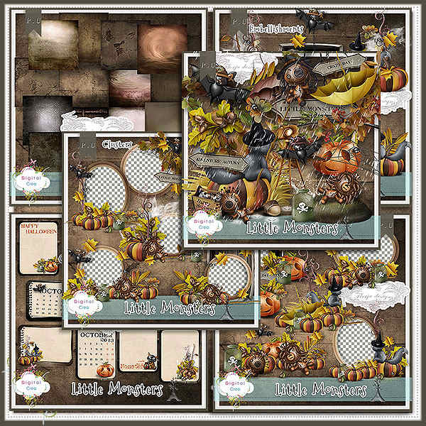 Мрачноватый скрап-наборчик на тему праздника Хэллоуин Little Monsters. Пожелтевшая листва, тыквы, монстрики, летучие мыши, старый сундук, фотоаппарат, зонтик, пузырёк с ядом, дерево, кластеры и фоны тёмного оттенка.