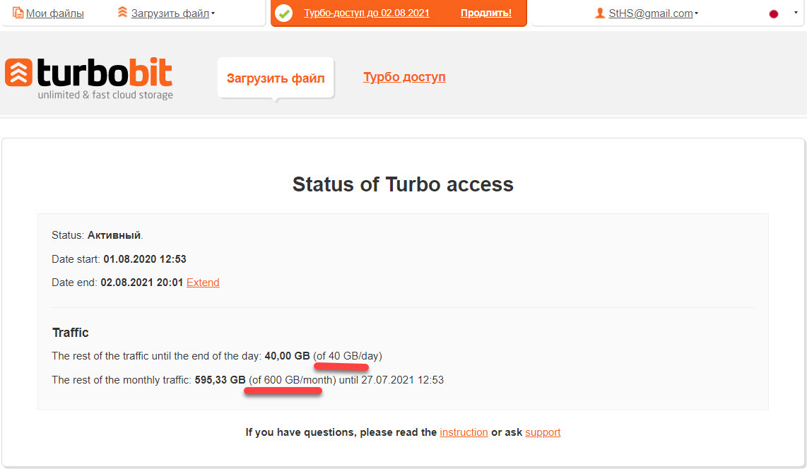 На все турбо-доступы распространяются официальные гарантия и техническая поддержка. Пользователь со стандартным премиум-аккаунтом может скачивать файлы общим объёмом до 40 ГБ в сутки, но не более 600 ГБ в месяц. Качать рекомендуем с помощью Internet Download Manager в 8 и более потоков.