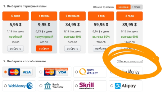 | Срок действия | Объем трафика | Цена без HTTPS | Цена с HTTPS |