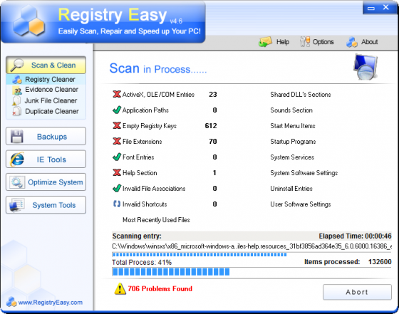 RegistryEasy - это программа, предназначенная для очистки реестра и оптимизации операционной системы Windows. Данная программа проверяет Ваш компьютер и легко находит и устраняет причины ошибок, вызывающих проблемы с компьютером. Проверяя системный реестр, программа Registry Easy определит ошибки, связанные с нехваткой загрузочных программ, нехваткой системных шрифтов, недействительными ярлыками, недостающими dll файлами, неверными инсталляциями программ, неверными драйверами устройств. Кроме того, обнаруженные ошибки могут быть связаны с отсутствием связей между файлами и недостатком файлов помощи. Позвольте программе RegistryEasy очистить Ваш реестр безопасно и эффективно!