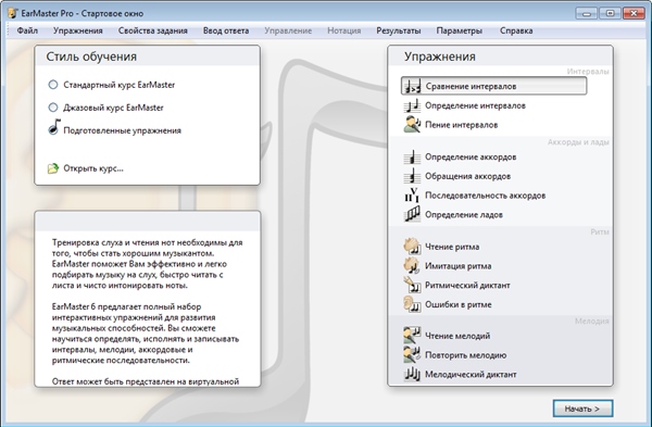 EarMaster 6 предлагает полный набор интерактивных упражнений для развития музыкальных способностей. Вы сможете научиться определять, исполнять и записывать интервалы, мелодии, аккордовые и ритмические последовательности.