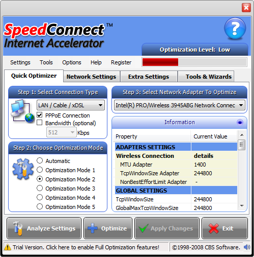 Because Windows default network settings have general values and are not optimized for a specific internet connection type, SpeedConnect software calculates, optimize and safely change several network related settings to known optimized values, in a recursive process, until it discovers the best settings for your specific connection. Basically, SpeedConnect applies optimized network settings values which will prevent the data packets fragmentation and will speed up your connection. All this translates into faster web browsing, faster e-mail, faster downloads and improved overall Internet performance.