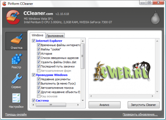 Кроме чистки Windows, CCleaner также умеет проводить удаление временных и др. ненужных файлов многих других программ, включая: Firefox, Opera, Media Player, eMule, Kazaa, Google Toolbar, Netscape, Office XP, Nero, Adobe Acrobat, WinRAR, WinAce, WinZip и др...