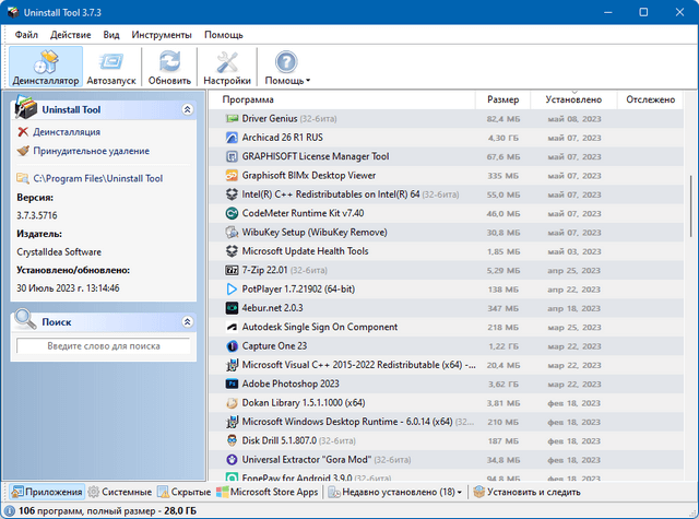 - Просмотр детальной информации о любой программе, установленной на вашем компьютере