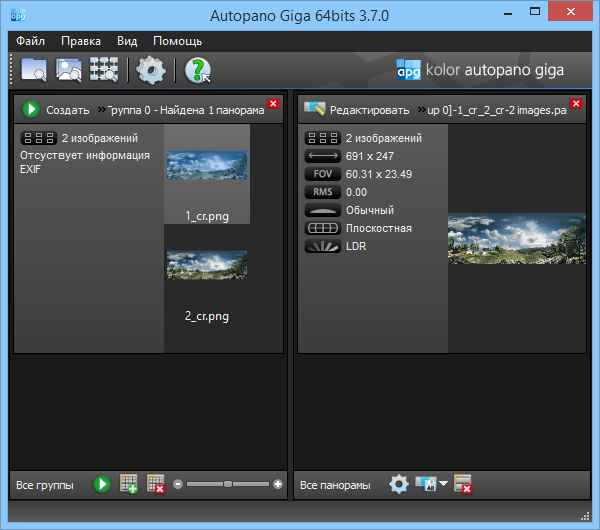 Autopano Giga - одна из лучших программ, позволяющая объединять несколько фотоснимков с частичным перекрытием в большой панорамный снимок. В отличие от многих популярных программ, применяемых для склейки панорам, здесь склейка происходит в полностью автоматическом режиме с использованием собственных алгоритмов SIFT и RANSAC, производящих склейку намного быстрее и точнее, полная поддержка HDR (High Dynamic Range). Работа с программой очень проста - достаточно лишь указать папку, содержащую одну или несколько серий снимков для объединения, и программа сама найдет и объединит эти снимки в панорамы. При этом, возможности практически неограниченны - можно создавать панорамы с полем зрения 360°-180°, содержащие неограниченное количество отдельных фотографий, при этом размер панорамы ограничен лишь размерами вашего винчестера. Области применения программы обширны: кинематография, архитектура, продажа недвижимости, картография, астрономия и т. д.