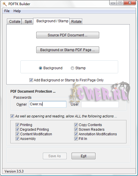 Так же PDFTK Builder позволяет менять фон для каждой страницы или же только для титульного листа, вставлять водяной знак и назначать пароль к документу.